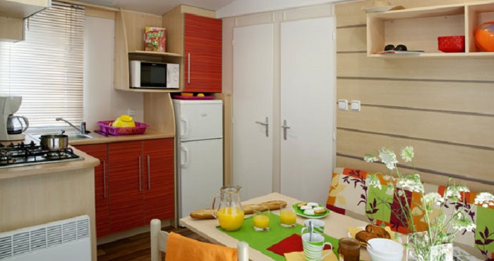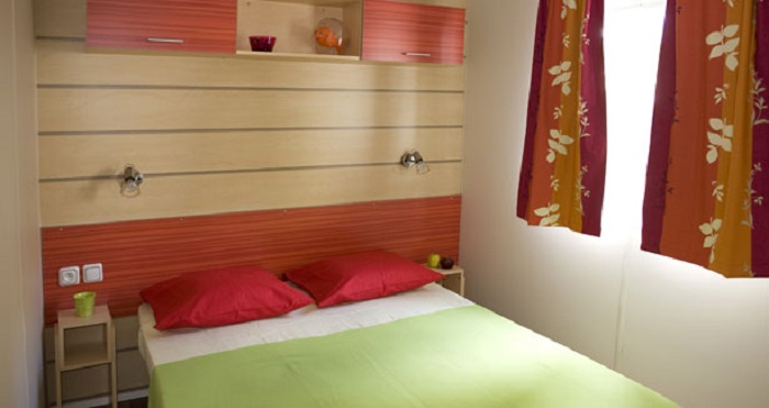 Mobil Home 4 Pièces 6 Personnes de 28m² minimum, composé d'un coin cuisine équipé, d'un coin repas, d'une chambre avec un lit double, d'une chambre avec 2 lits simples, d'une chambre avec 2 lits superposés, d'une salle d'eau, de WC séparés (excepté dans certains hébergements) et d'une terrasse.