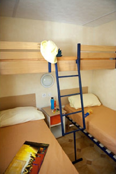 Mobil Home 3 Pièces 5 Personnes de 21m² minimum, composé d'un coin cuisine équipé, d'un coin repas avec banquette convertible, d'une chambre avec un lit double, d'une chambre avec 2 lits simples + 1 lit superposé (ne convient pas aux enfants de moins de 6 ans) ou d'appoint, d'une salle d'eau, de WC séparés (excepté dans certains hébergements) et d'une terrasse.A noter : dans certains hébergements, le 3ème lit de la chambre enfants est remplacé par la banquette convertible du salon.