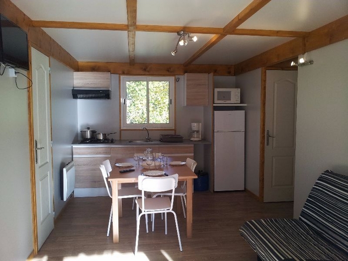 Le Chalet comprend un coin cuisine équipé avec réfrigérateur, plaque gaz, micro-ondes, cafetière, vaisselle. La terrasse dispose d'un salon de jardin.