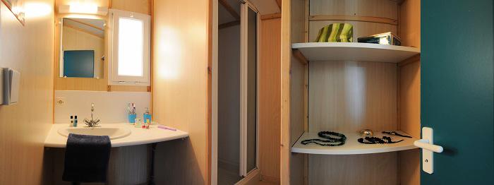 Chalet 3 pièces de 40m² pour 4 personnes composé d'un séjour, 1 chambre avec 1 grand lit, 1 chambre avec 2 lits, salle d?eau (douche, lavabo), WC indépendants. Kitchenette équipée. Terrasse avec mobilier de jardin.