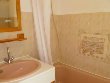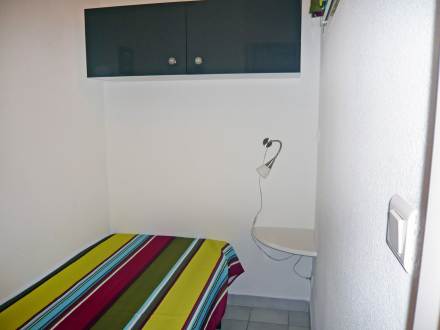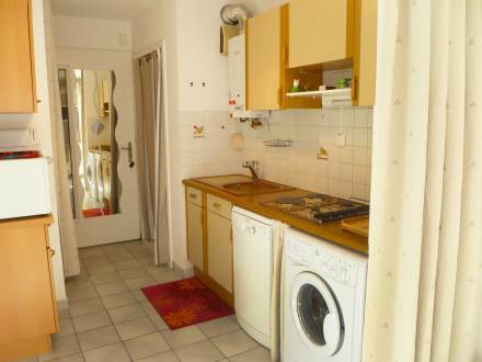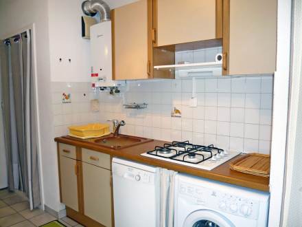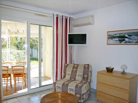 "Les Jardins de la Plage" studio 32 m2, au rez-de-chaussée, clair, aménagement très confortable et agréable: séjour/salle à manger avec véranda avec 1 divan-lit double (140 cm, longueur 200 cm), TV (écran plat), lecteur CD, DVD et air-conditionné. Sortie sur le jardin. Cabine ouverte avec rideau avec 1 x 1 lits superposés (90 cm, longueur 190 cm). Cuisine ouverte (4 plaques de cuisson, mini-four, lave-vaisselle, four micro-ondes, congélateur). Bain/WC. Chauffage électrique. Grand jardin 90 m2, situation sud et situation ouest. Meubles de terrasse, barbecue électrique, chaises longues (2). A disposition: lave-linge. Place de parking No 13. L'accès au jardin se fait par 3 marches.