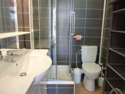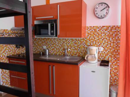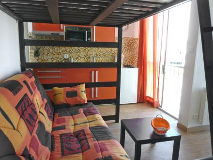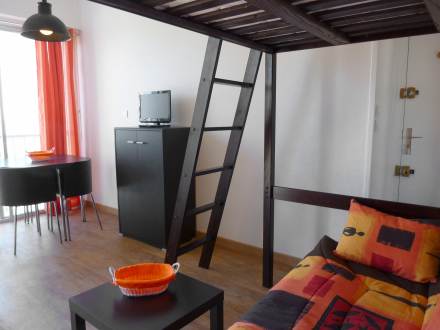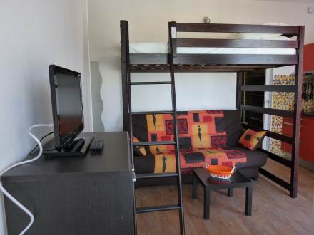 Studio 18 m2 au 5ème étage, aménagement confortable et moderne: séjour/salle à manger avec baie vitrée avec 1 grand-lit et TV (écran plat). Coin cuisine (plaque vitro céramique, combiné micro-ondes). Douche/WC. Chauffage. Vue latérale sur la mer. Veuillez noter: pas de parking. Veuillez noter : Le lit se trouve en hauteur et est accessible par une échelle.