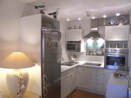 Apt 2 pièces 42 m2 au 1er étage, situation sud, aménagement confortable et moderne: séjour/salle à manger avec 1 divan-lit double, TV, vidéo et air-conditionné. Sortie sur la terrasse, sur la loggia. 1 chambre avec 1 grand-lit. Sortie sur la loggia. Coin cuisine (4 plaques de cuisson, four, four micro-ondes, congélateur). Douche, WC séparé. Terrasse 20 m2, situation sud. Meubles de terrasse, chaises longues (4), loggia. Belle vue sur la mer et le jardin belle vue sur L'Ile de Porquerolle. A disposition: lave-linge, sèche-cheveux. Place de parking. Douche avec jets hydro-massage. Loggia de 6.25 m2 équipée de baies coulissantes pouvant s'ouvrir entièrement sur la terrasse privative de 20m2. Départ 9h.