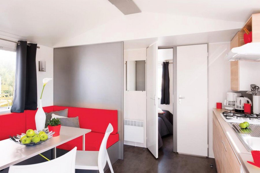 Mobil Home Premium 3 Pièces 4 Personnes de 27m² composé d'un grand salon avec banquette, d'une cuisine équipée, d'une chambre avec un grand lit, d'une chambre avec 2 lits de 80*190, d'une salle de bains avec douche, lavabo et WC séparés. Couvertures et oreillers fournis. Possibilité de rajouter un lit bébé