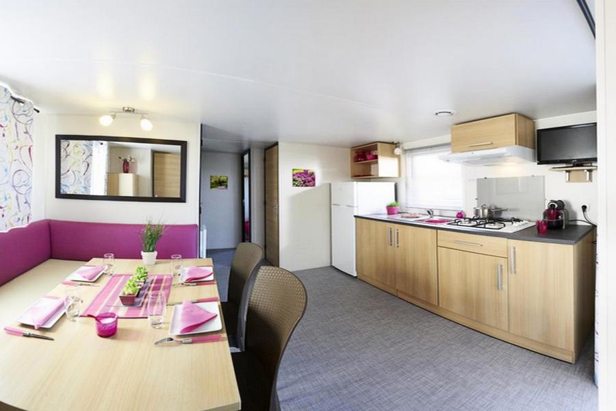 Le mobil-home dispose d'une cuisine équipée avec plaque 4 feux, hotte aspirante, évier avec eau chaude / eau froide, réfrigérateur-congélateur, micro-ondes, 1 lave-vaisselle. Le logement dispose également d'un accès wifi gratuit, d'une télévision et d'une terrasse en bois avec 2 transats.