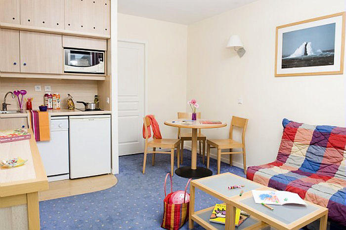 Studio pour 4 personnes de 22m² environ comprenant un séjour avec 1 canapé-lit double, un coin cabine dans l?entrée avec 2 lits superposés, une salle de bains, des WC séparés, un coin cuisine équipé et un balcon (pour la plupart des appartements).A noter : Le couchage en hauteur ne convient pas aux enfants de moins de 6 ans.