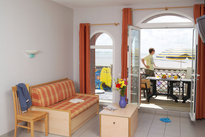 Appartement de 2 pièces pour 5 personnes de 31 à 39m², composé d'un séjour avec canapé lit, d'une chambre avec 1 grand lit et 1 lit simple, d'une salle de bains ou douche, toilettes (certains avec toilettes séparés), cuisine équipée. La plupart des appartements ont balcon ou terrasse avec une vue sur l'océan.