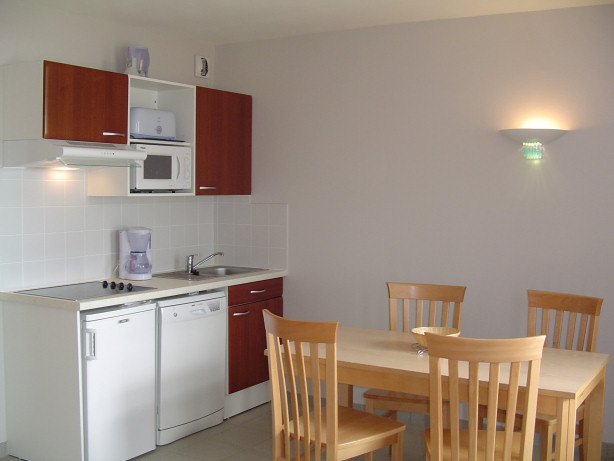 Appartement composé d'une cuisine aménagée avec lave vaisselle, d'un réfrigérateur, d'un four mixte (grill-micro-ondes), d'une plaques de cuisson, d'une cafetière électrique, d'une bouilloire électrique, d'un grille pain, d'un ustensiles de cuisine. La télévision est disponible dans le salon avec supplément.