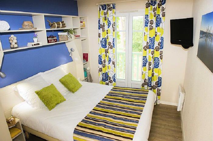 Studio de 25m² pour 5 personnes comprenant un séjour avec 2 lits banquettes dont 1 avec 1 lit gigogne (recommandé pour les enfants) et un coin cabine avec 2 lits superposés, une salle de bains et des WC séparés. Appartements en rez-de-jardin, équipés pour personnes à mobilité réduite. Vue Pinède et Golf