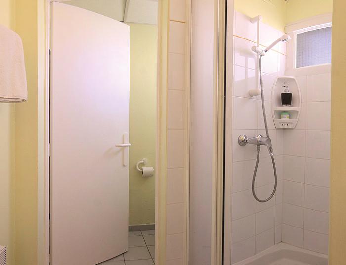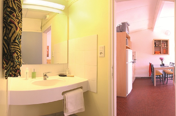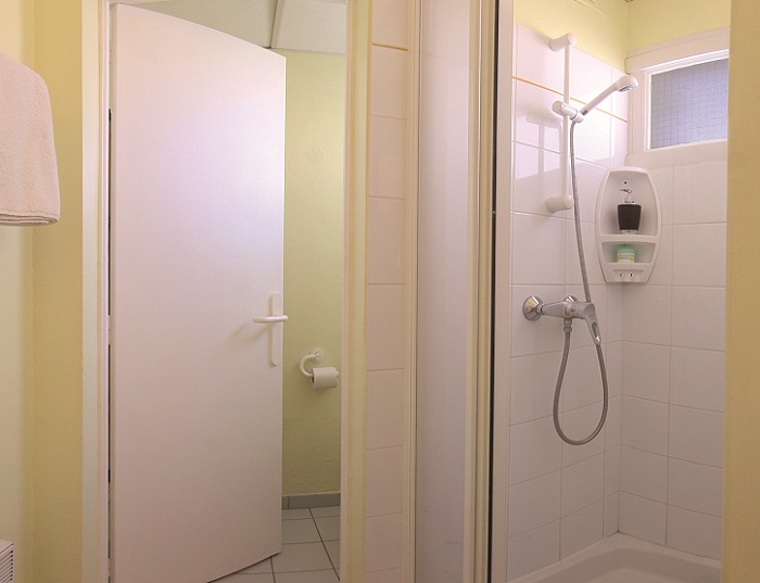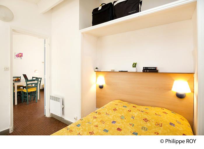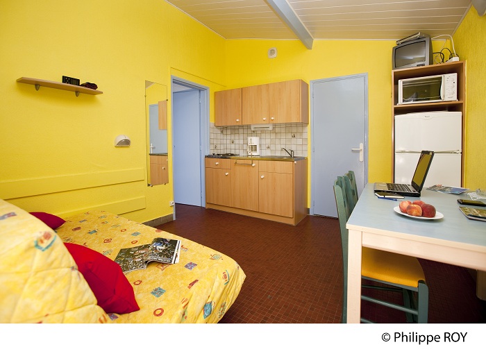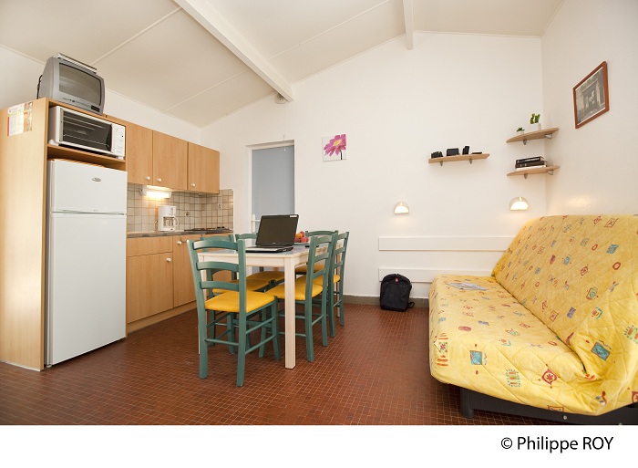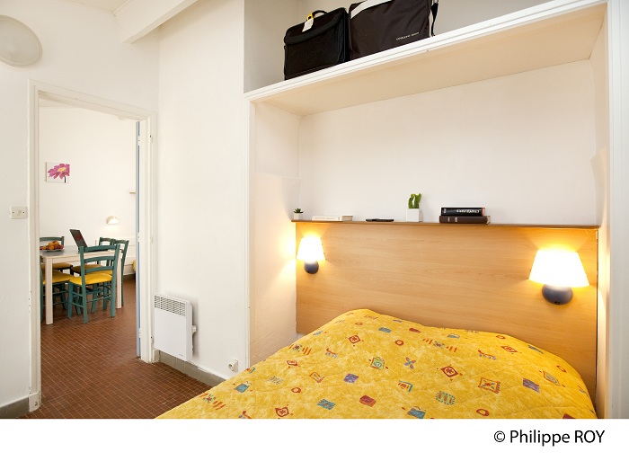 Appartement 2 pièces pour 4 personnes de 27m², composé d'un séjour-chambre avec un canapé lit pour 2 personnes, d'une chambre avec un lit simple, d'une kitchenette équipée, d'une salle d'eau avec douche, lavabo et de WC indépendant.