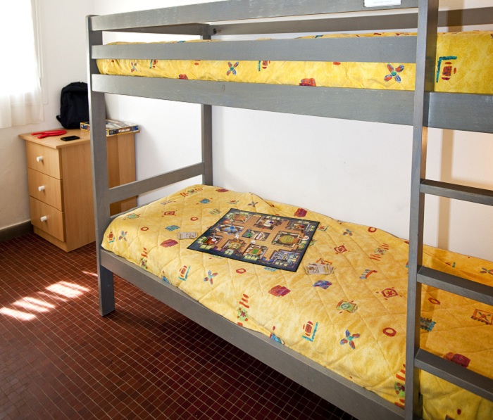 Appartement de trois pièces de 43m² pour six personnes comprenant un séjour avec un canapé lit, une chambre avec deux lit superposés, une autre chambre avec un lit double et une salle d'eau avec lavabo, douche et des toilettes.