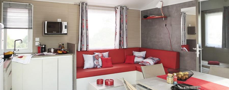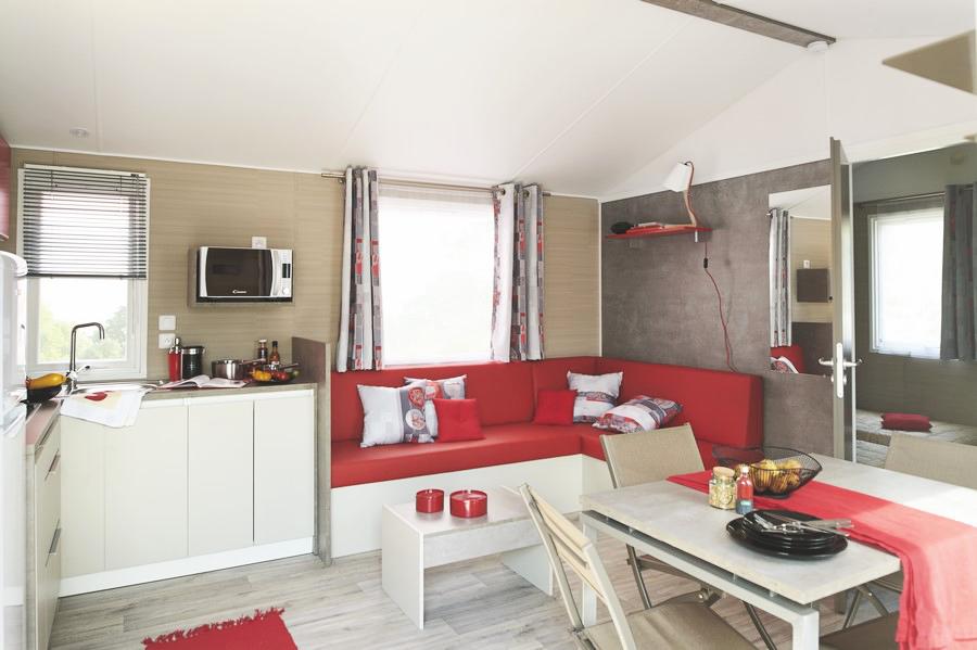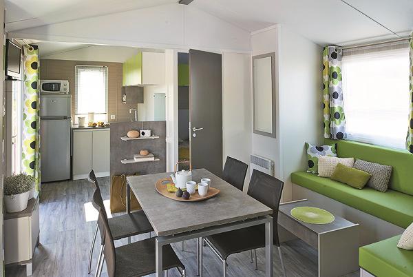 Mobil Home de 31m² pour 4/6 personnes composé d'un coin cuisine équipé, d'un séjour avec banquette convertible en lit pour 2 personnes, d'une chambre avec 1 lit double, d'une chambre avec 2 lits simples, d'une salle de bain avec douche et lavabo, de WC séparés et d'une terrasse semi-couverte.