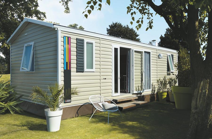 Mobil Home de 24m² pour 4 personnes composé d'un séjour avec banquette, d'un coin cuisine équipé, d'une chambre avec 1 lit double, d'une chambres avec 2 lits simples, d'une salle de bain avec douche et lavabo, de WC séparés et d'une terrasse.