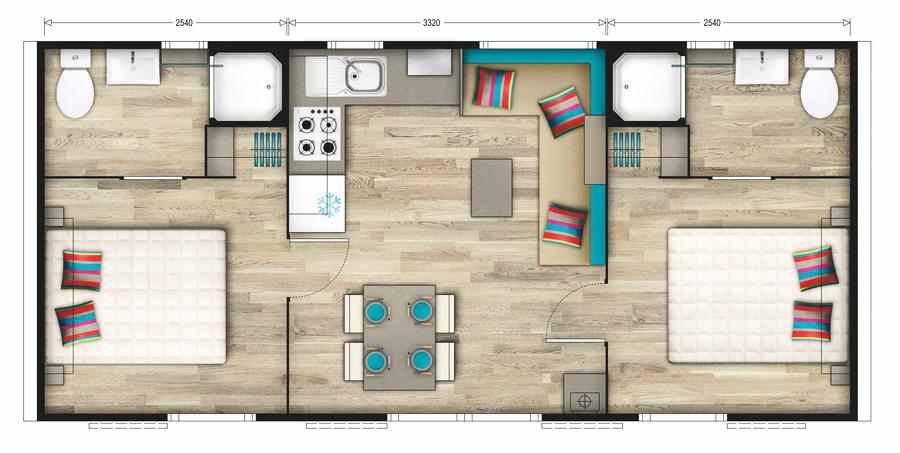 Mobil-home 3 pièces 4 personnes de 32m² composé d'un coin séjour, d'une kitchenette équipée, d'une chambre avec lit double, d'une chambre avec 2 lits simples, de deux salles de douche avec WC attenantes aux chambres et d'une terrasse.