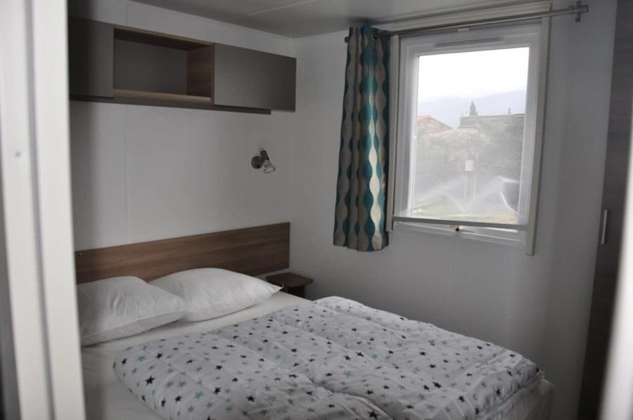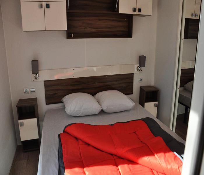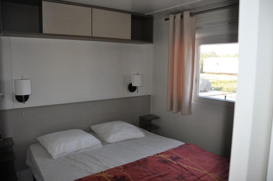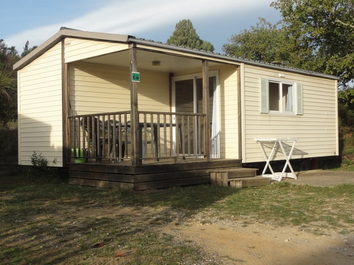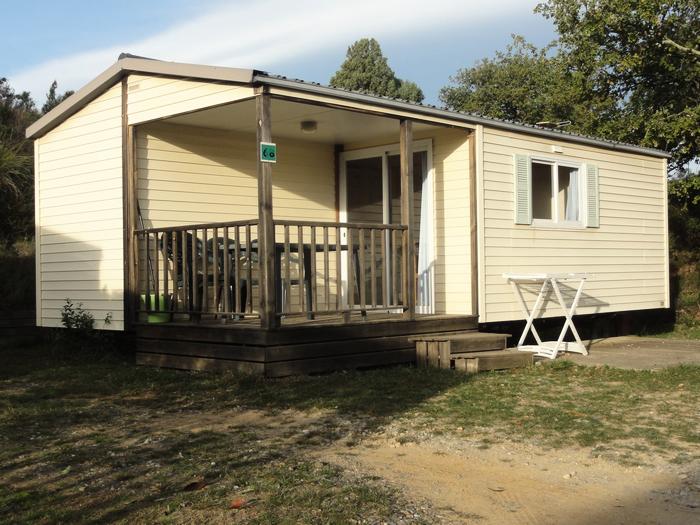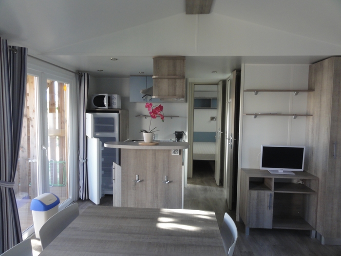 Mobil home 3 Pièces 4 Personnes d'environ 31m² composé d'un coin salon, d'un coin cuisine équipé, d'une chambre avec 1 lit double (140) , d'une chambre avec 2 lits simples (80), d'une salle de bain et d'une terrasse.