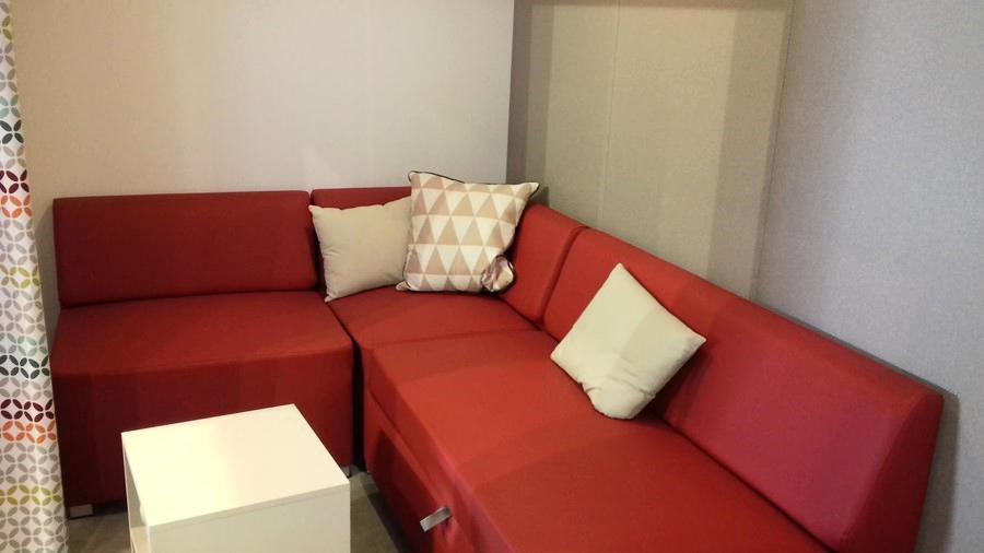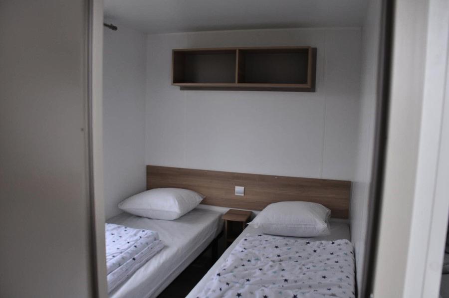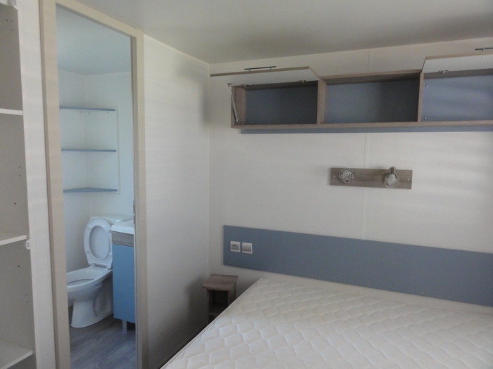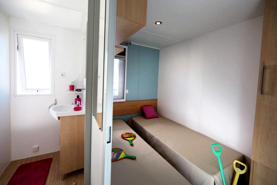 Mobil Home 3 Pièces 4 Personnes d'environ 26m² composé d'un coin salon, d'un coin cuisine équipé, d'une chambre avec 1 lit double (160) , de 2 chambres avec 2 lits simples chacune (80), de 2 salles de bain dont 1 dans la chambre double.