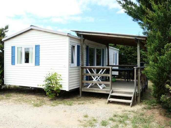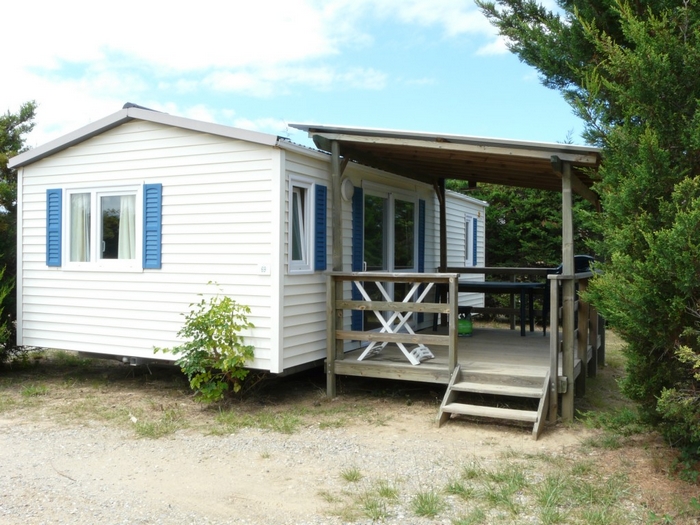 Mobil Home 3 Pièces 4 Personnes d'environ 31m² composé d'un coin salon, d'un coin cuisine équipé, d'une chambre avec 1 lit double (140) , d'une chambre avec 2 lits simples, d'une salle de bain avec WC. Terrasse ombragée.