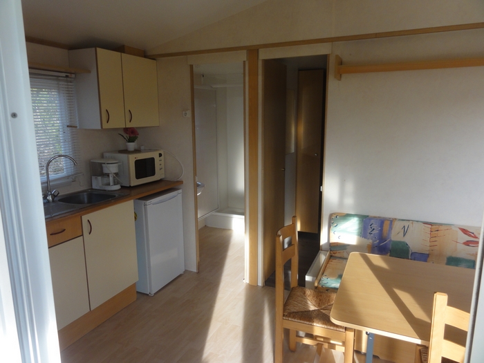 Le mobil home comprend un coin cuisine équipé avec réfrigérateur, plaques de cuisson, cafetière électrique, micro-ondes, ustensiles de cuisine et vaisselle adaptée au nombre de personnes.