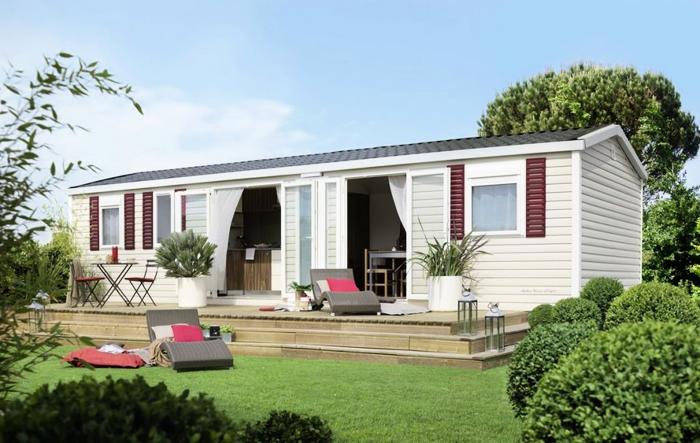 Mobil Home Trigano 3 pièces 4 personnes de 29m² environ climatisé, composé d'un coin salon, d'un coin cuisine équipé, d'une chambre avec un lit double (140x190), d'une chambre avec 2 lits simples (80x190), d'une salle de douche, de WC séparés et d'une terrasse intégrée. Ancienneté : nouveauté 2017