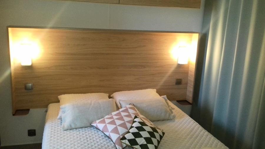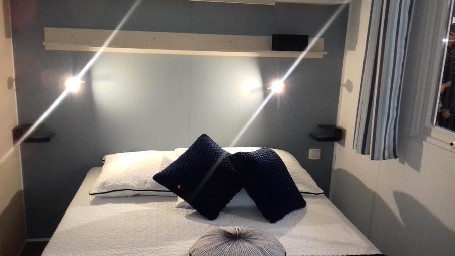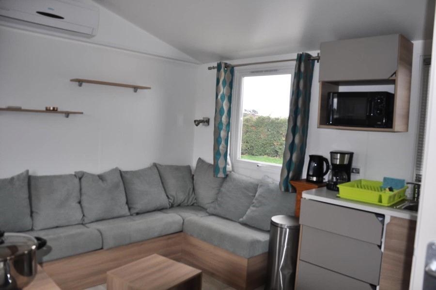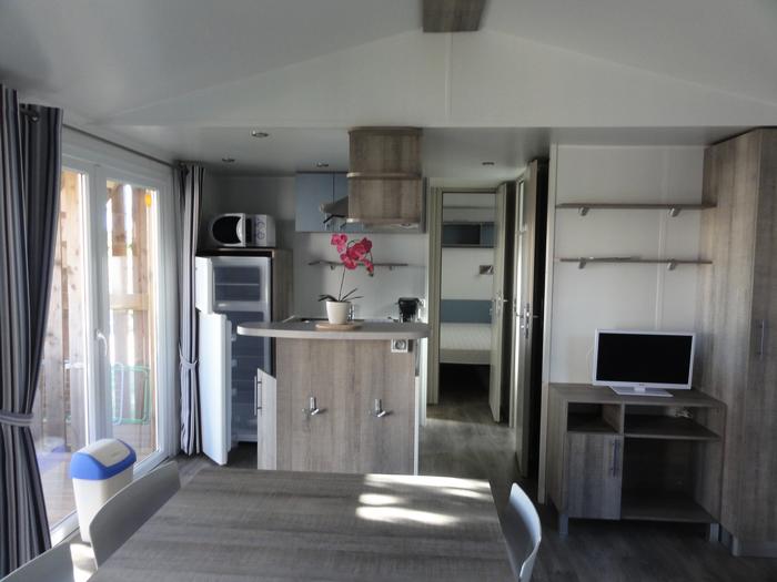 Mobil Home Roller 3 pièces 4 personnes de 34m² environ climatisé, composé d'un coin salon, d'un coin cuisine équipé, d'une chambre avec un lit double (160x190), d'une chambre avec 2 lits simples (90x190), d'une salle de douche, de WC séparés et d'une terrasse.
