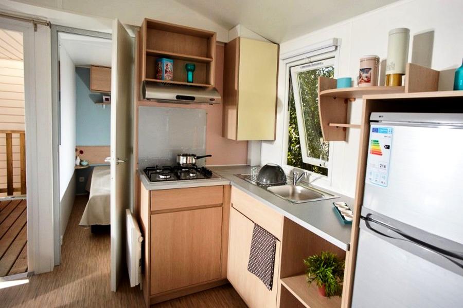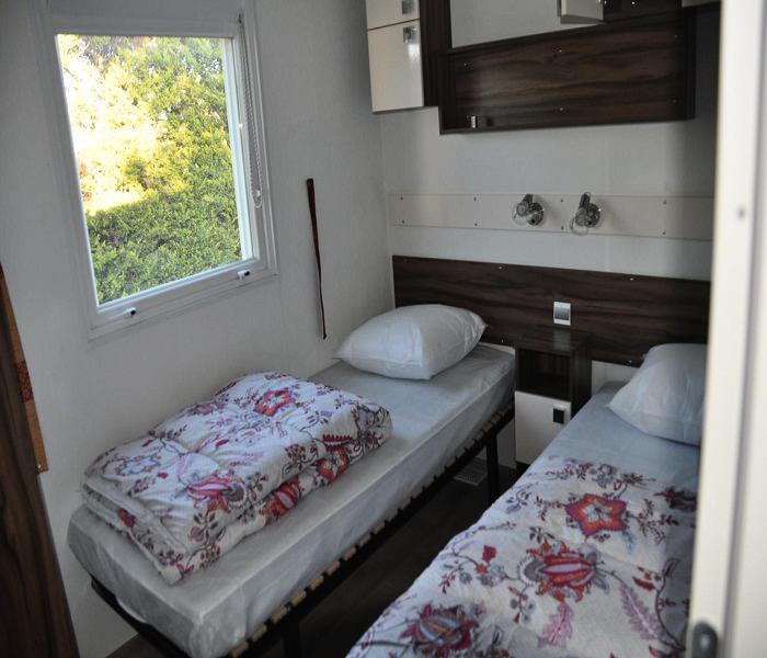 Mobil Home 3 Pièces 4 Personnes d'environ 26m² composé d'un coin salon, d'un coin cuisine équipé, d'une chambre avec 1 lit double (160) , d'une chambre avec 2 lits simples (80), d'une salle de bains et d'une terrasse.