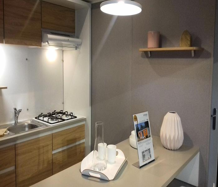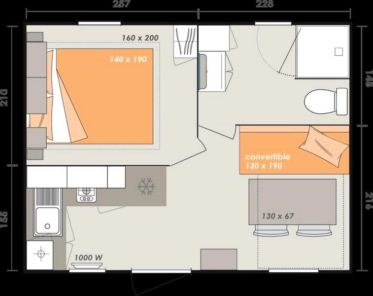 Mobil home 2 Pièces 2 Personnes d'environ 20m² composé d'un coin cuisine équipé et coin repas, d'une chambre avec 1 lit double (140) , d'une salle de bain et d'une terrasse.