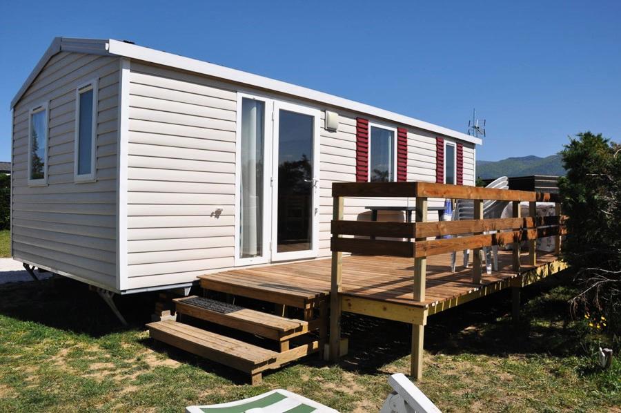 Mobil home 3 Pièces 4 Personnes d'environ 32m² composé d'un coin salon, d'un coin cuisine équipé, d'une chambre avec 1 lit double (140) , d'une chambre avec 2 lits simples (80), d'une salle de bain et d'une terrasse.