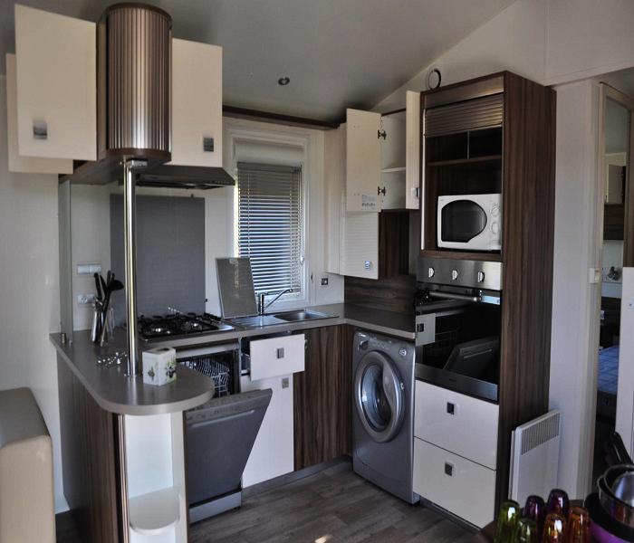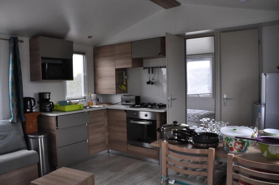 Le mobil home comprend un coin cuisine équipé avec réfrigérateur, plaques de cuisson, four, micro-ondes, cafetière électrique, ustensiles de cuisine et vaisselle adaptée au nombre de personnes.