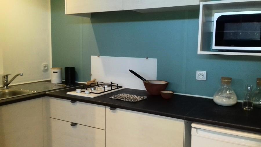 Le mobil home comprend un coin cuisine équipé avec réfrigérateur, plaques de cuisson, four, ustensiles de cuisine et vaisselle adaptée au nombre de personnes dans le logement.