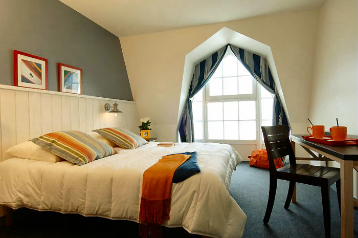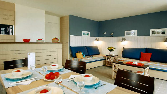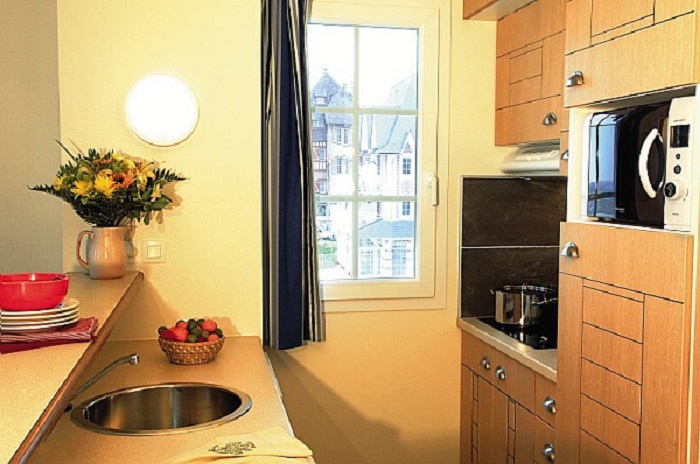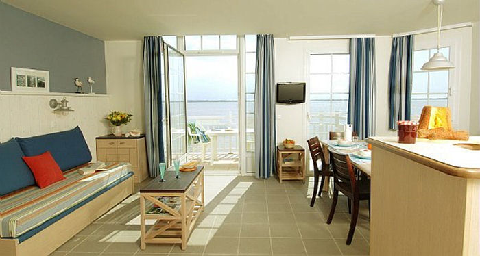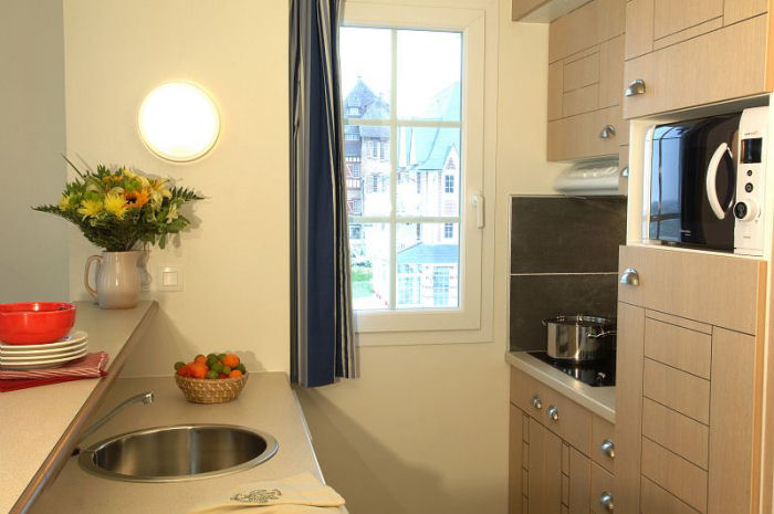 Studio de 30m² environ pour 4 personnes composé d'un séjour avec deux banquettes-lits simples, d'une alcôve avec deux lits superposés, d'un coin cuisine équipé et d'une salle de bains avec baignoire et de WC.Cinq studios sont prévus pour personnes à mobilité réduite.A noter : Le couchage en hauteur ne convient pas à des enfants de moins de 6 ans.