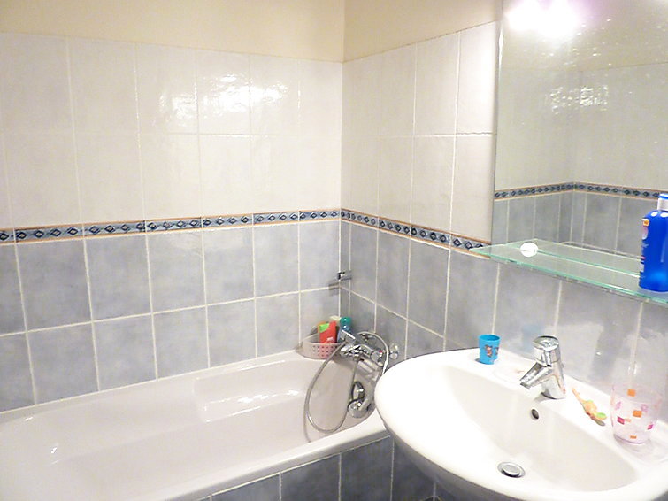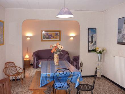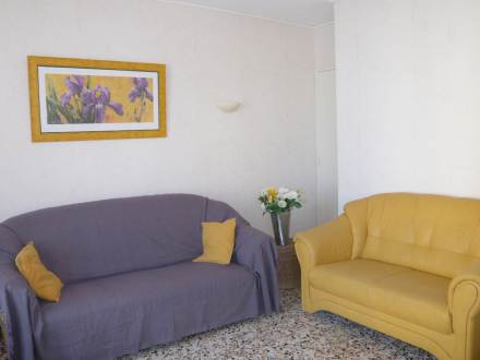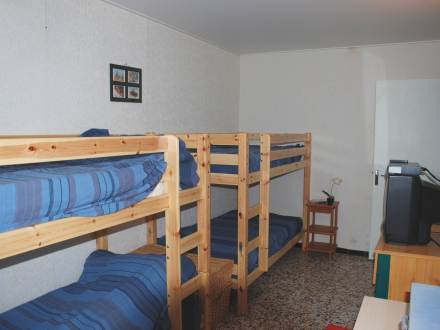 Apt 3 pièces 80 m2 au 2ème étage: séjour/salle à manger avec TV. 1 chambre avec 1 grand-lit. 1 chambre avec 2 x 2 lits superposés, TV et DVD. Cuisine ouverte (4 plaques de cuisson, four, lave-vaisselle, four micro-ondes, congélateur). Salle de bains, WC séparé. Balcon 20 m2, situation ouest. Vue latérale sur la mer. A disposition: lave-linge.