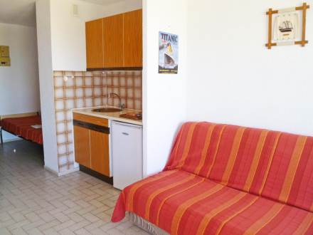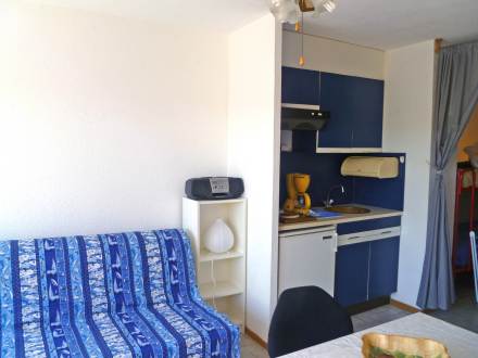 Studio 22 m2 au 3ème étage: séjour/salle à manger avec 1 divan-lit double et TV. Entrée avec 1 lit. Coin cuisine (2 plaques de cuisson, four micro-ondes). Terrasse 4 m2, situation nord-est. Meubles de terrasse. Place de parking. Maximum 1 animal/ chien autorisé.