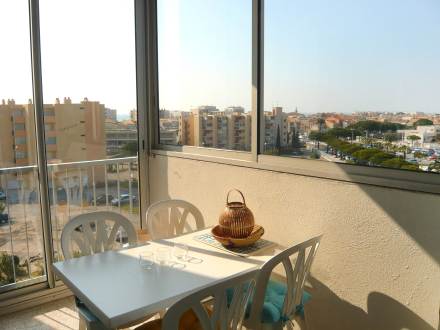 Apt 2 pièces 32 m2 au 5ème étage: séjour/salle à manger avec 1 divan-lit double, TV et air-conditionné. 1 chambre avec 1 grand-lit et air-conditionné. Coin cuisine (2 plaques de cuisson, four, lave-vaisselle, four micro-ondes). Bain/WC. Petite terrasse 5 m2, couverte, situation ouest. Meubles de terrasse. Vue éloignée sur la mer.