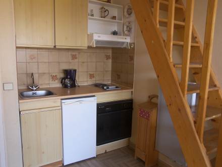 Studio 20 m2 au 3ème étage: séjour/salle à manger avec 1 divan-lit double. Sortie sur la terrasse. Petite galerie mansardée hauteur plafond 100 - 130 cm, sans fenêtre. Coin cuisine (2 plaques de cuisson, four). Douche/WC. Chauffage électrique. Terrasse 12 m2, situation sud. Meubles de terrasse. Belle vue sur la mer. Place de parking. Maximum 1 animal/ chien autorisé. L'accès à la galerie se fait par un escalier raide. Aucun couchage dans la galerie.