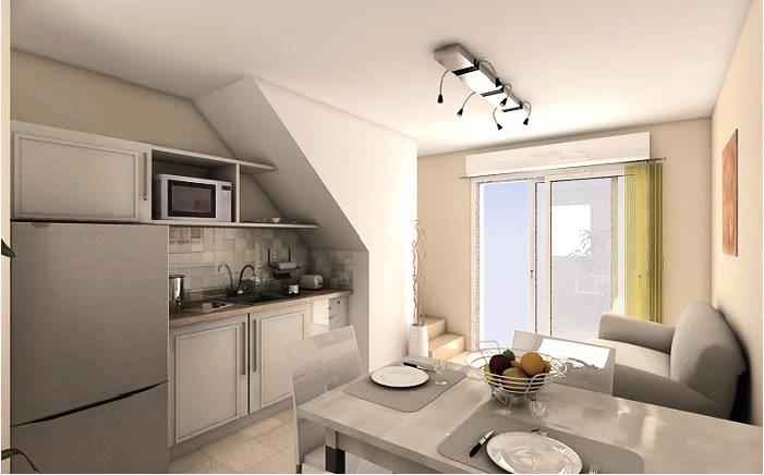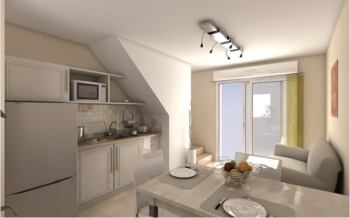 Appartement pour 2 Personnes composé d'un séjour, d'une kitchenette équipée, d'une chambre avec 2 couchages, d'une salle de bains ou de douche avec WC.