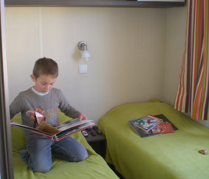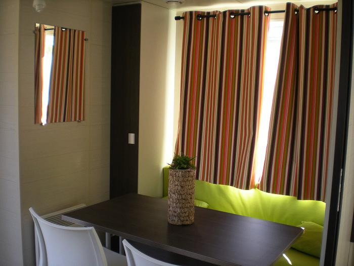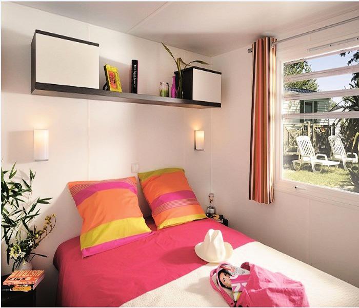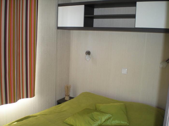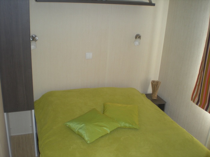 Mobil Home 3 Pièces 4 Personnes de 18m² composé d'un coin cuisine équipé, d'un coin salon, d'une chambre avec 1 lit double, d'une chambre avec 2 lits simples. Terrasse. A noter: Ce logement ne dispose pas de sanitaires.