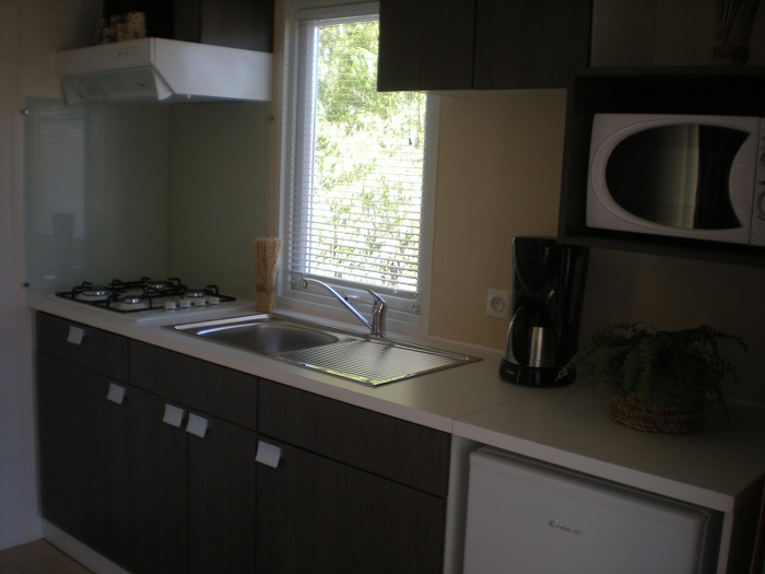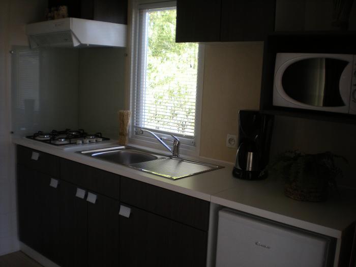 Le Mobil home comprend un coin cuisine équipé avec réfrigérateur, plaques gaz, cafetière, vaisselle et ustensiles de cuisine. La terrasse dipose d'un salon de jardin.