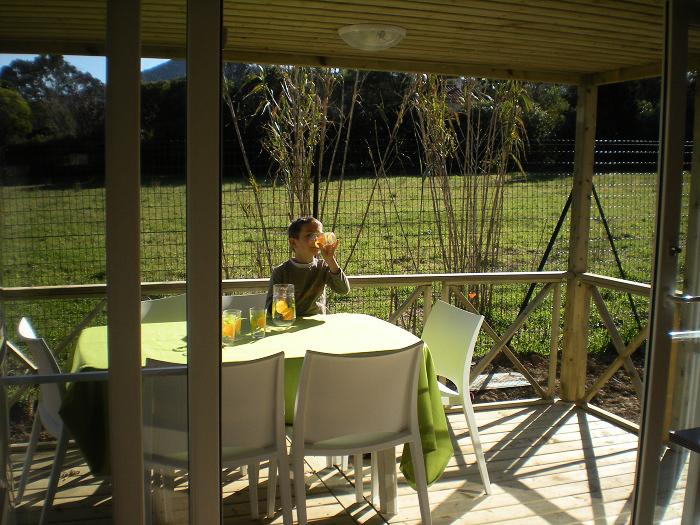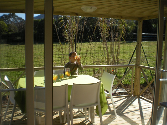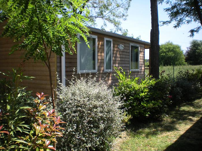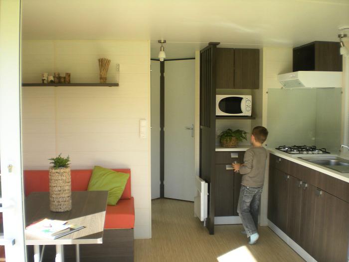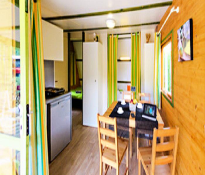 Le lodge comprend une kitchenette avec réfrigérateur/congélateur, 4 feux de cuisson, micro-ondes, cafetière électrique, batterie de cuisine et vaisselle.Terrasse en bois avec salon de jardin et transat.