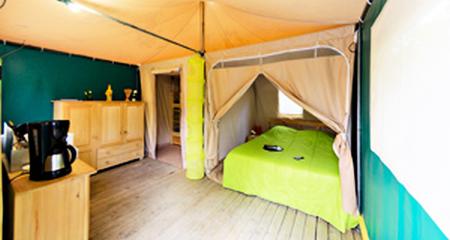Lodge 3 Pièces 4 Personnes composé d'un coin cuisine, d'un coin salon, d'un coin chambre avec 1 lit double, d'un coin chambre avec 2 lits simples. Terrasse. A noter: Ce logement ne dispose pas de sanitaires.