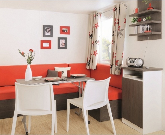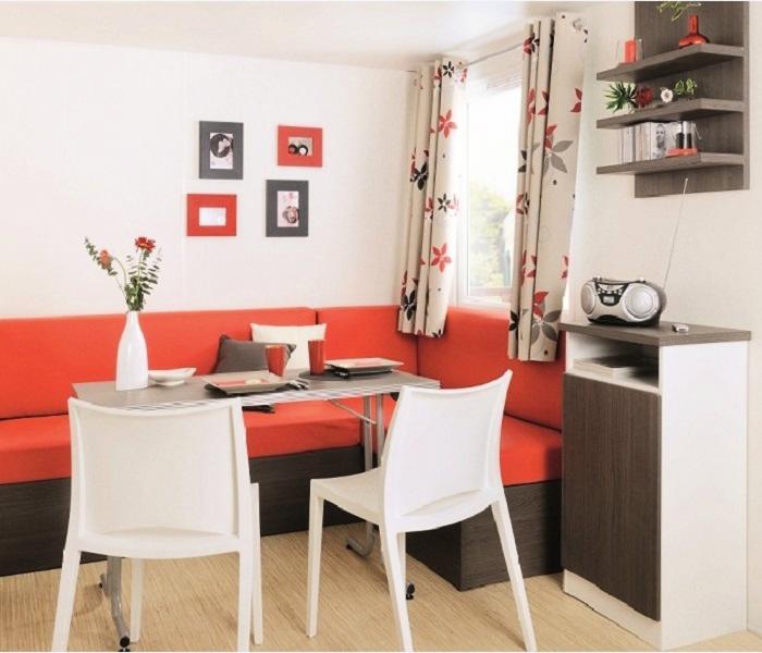 Lodge 2 Pièces 2/4 Personnes, de 20m² composé d'un espace à vivre avec un coin repas et 2 banquettes convertibles, d'une kitchenette équipée, d'une chambre avec 1 lit double et d'une salle de bains avec WC.