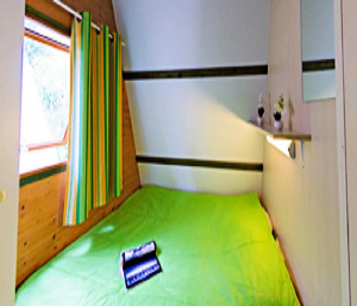 Lodge 3 Pièces 5 Personnes, de 29m² composé d'un espace à vivre avec coin repas, d'une kitchenette équipée, d'une chambre avec 1 lit double, d'une chambre avec 1 lit simple et 2 lits superposés et d'une salle de bains avec WC.