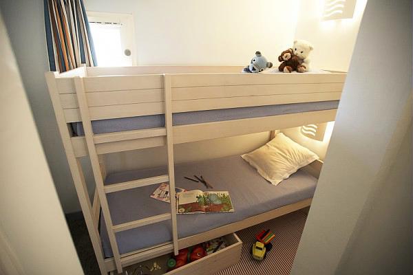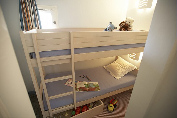 Appartement de deux pièces pour six ou sept personnes d'environ 43m² comprenant un séjour avec deux banquettes lits simples dont une avec un lit gigogne, une cabine avec deux lits superposés, une chambre avec un lit double, une salle de bains et des toilettes séparés.
