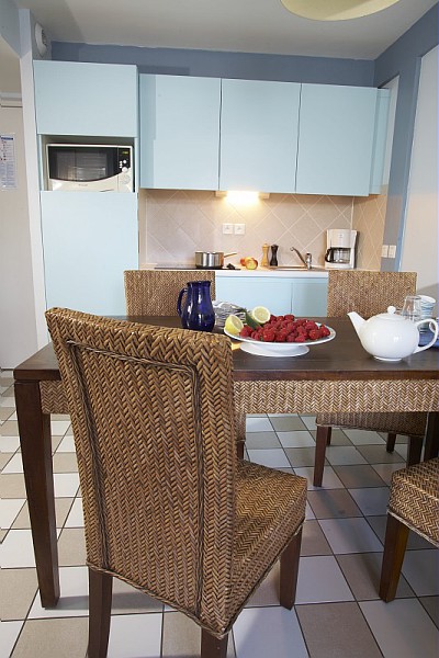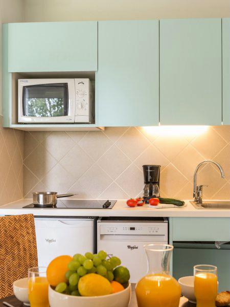 L'appartement comprend un coin cuisine entièrement équipé : 4 plaques vitrocéramiques, un réfrigérateur, un four à micro-ondes, un lave-vaisselle et une cafetière électrique.