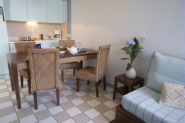 Appartement avec un coin cuisine entièrement équipé de 4 plaques vitro-céramiques, d'un réfrigérateur, d'un micro-ondes grill et d'un lave-vaisselle, une cafetière électrique.Téléphone (payant), télévision. Balcon avec chaises de jardin.
