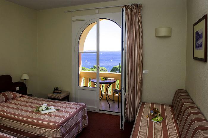 Chambre entre 16 et 18m² pour 3 personnes, située côté mer, composée d'un lit double et d'un lit simple ou 3 lits simples, d'une salle de bains avec une douche et un WC.