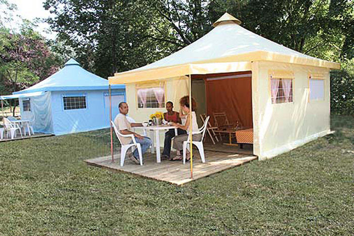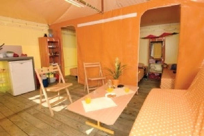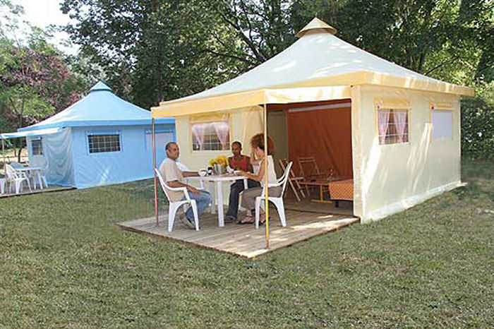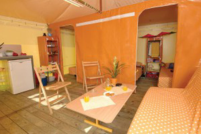 Bungalow de 20m² pour 5 personnes, composé d'un sol en dur et d'une épaisse tente en toile, équipé d'un coin repas avec un kitchenette équipée, d'un coin nuit avec "côté parent" un lit double et "côté enfant" 2 lits simples, un convertible et d'une terrasse couverte par un auvent. A noter : le bungalow ne possède pas d'évier ni de sanitaires. Libre accès aux blocs sanitaires du camping. Le logement est recommandé pour 4 personnes. Ce logement atypique est un bon compromis entre le confort d'un mobil home et les vraies valeurs du camping, proche de la nature.