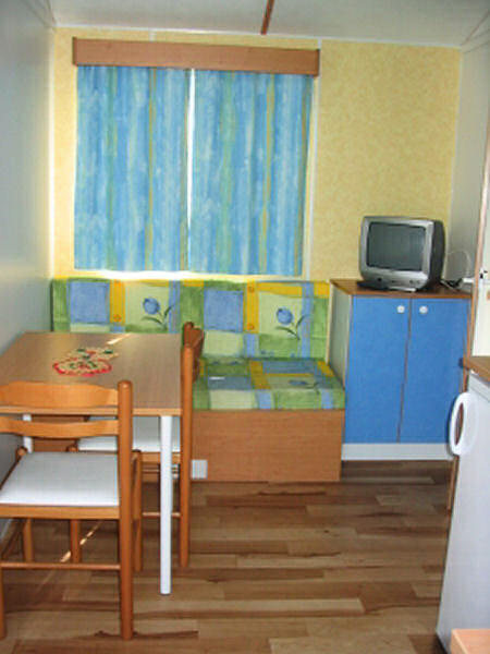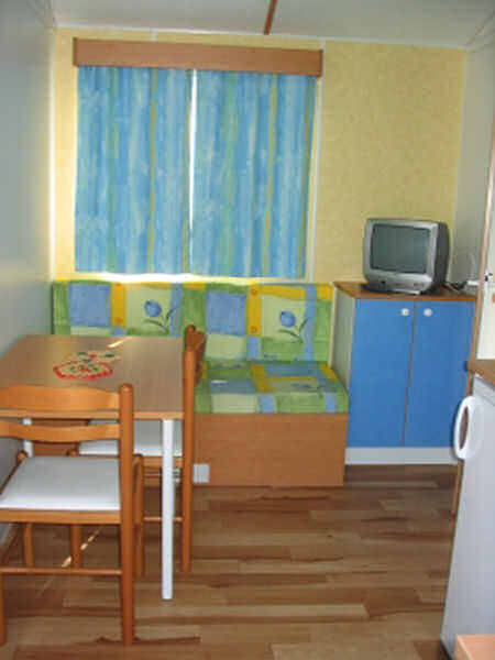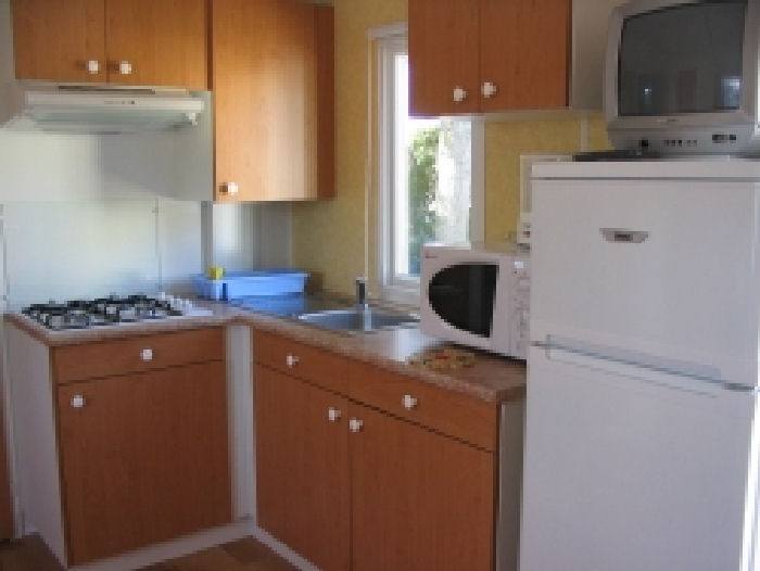 Dans le séjour-cuisine vous trouverez une table et des chaises, un frigo top, une hotte, une plaque 2 feux, un chauffe-eau, des placards, un évier, de la vaisselle et des ustensiles de cuisine.De nombreux rangements sont à disposition dans la chambre.Le mobil-home comprend aussi un salon de jardin et un parasol.