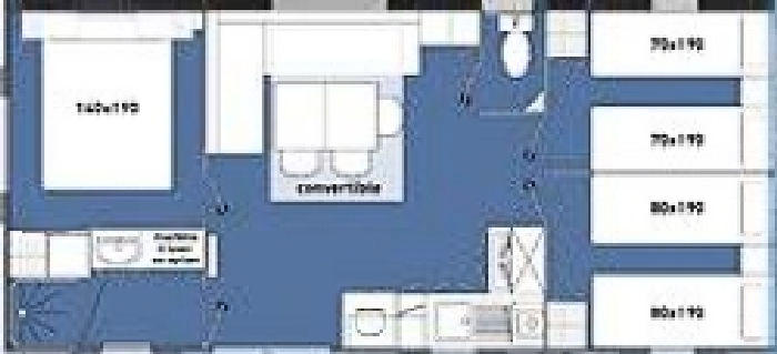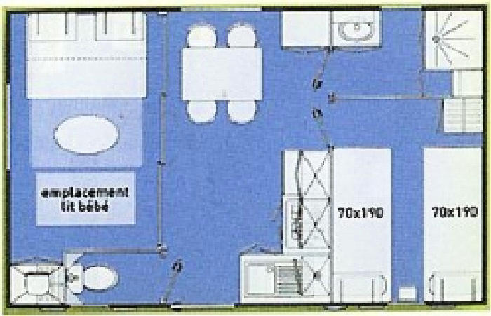 Pour avoir plus de détails et réserver cet hébergement, choisissez une date ci-dessus et cliquez sur voir l'offre ! Vous serez redirigé vers le site proposant la location.Mobil home 3 pièces pour 4/6 personnes de 30m² environ, composé d'un coin salon avec une banquette convertible pour 2 personnes, d'un coin cuisine équipé, d'une chambre avec un lit double (140x190), d'une chambre avec 2 lits simples (70x190), d'une salle de douche, d'un WC séparé et d'une terrasse en bois semi-couverte.