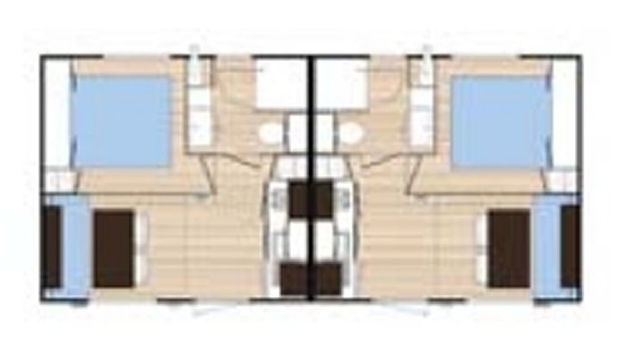 Mobil-home de 30m² pouvant accueillir entre 4 et 6 personnes composé d'un séjour-cuisine avec banquette convertible, d'une salle d'eau avec douche et lavabo, de toilettes indépendants, d'une chambre avec un lit double et d'une chambre avec 2 lits simples. Terrasse en bois semi-couverte.