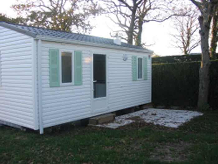 Mobil-home de 22m² pouvant accueillir jusqu'à 4 personnes et composé d'un séjour-cuisine avec banquette, d'une chambre avec un lit double, d'une chambre avec 2 lits simples, d'une salle d'eau avec douche et lavabo avec toilettes indépendants et d'une terrasse dallée avec salon de jardin et parasol.